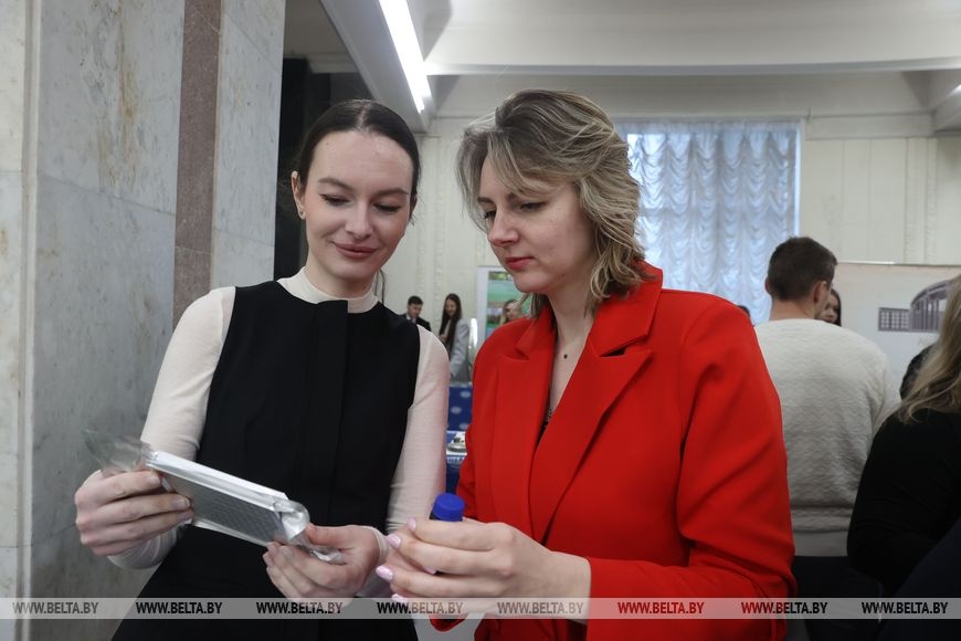 Задора Илона Сергеевна, младший научный сотрудник УП «ХОП ИБОХ НАН Беларуси», и Бадор Надежда Геннадьевна, биолог клинико-диагностической лаборатории Городской клинической инфекционной больницы, в ходе представления проекта по разработке отечественных тест-систем для диагностики цитомегаловирусной инфекции.